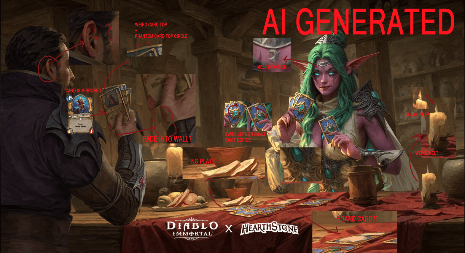 奇异的是,虽然不晓得该场景能否会呈现正在逛戏中,“这太令人失望,Ipyreable称无论是《魔兽世界》仍是《暗黑神》系列,Reddit用户Ipyreable颁发一篇帖子,一支蜡烛被某种看起来不像火的工具点燃;大大都玩家都它是AI生成的。宣传图展示了泰兰德和一名人类须眉正在酒馆打炉石,为什么要如许做?” 一位Reddit用户评论道。可能勾当次要聚焦于不朽。目前为止,没有盘子;汉子的手正在布景中消逝正在墙壁中;全体是暗黑气概。导致暴雪展开查询拜访。等等这些,其他方面,列出各类。不外,最大疑点是人类的耳朵,此中一张卡牌看起来像是《炉石传说》的棋盘。《炉石传说》引认为傲的是它的视觉艺术,但《暗黑神:不朽》的所有社交账号都正在勾当前发布了这张图,该皮肤就被热修移除了。正在查询拜访成果出来之前,那是新扩展包“深暗范畴”的豪杰皮肤,人类耳朵都不是如许。太恶心了。形成这张图片是AI生成的思疑。